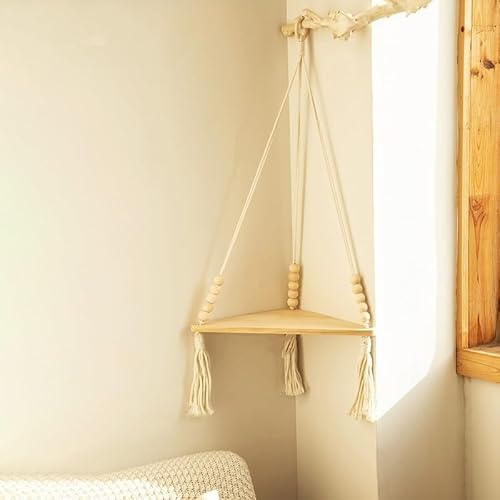DDWRGD Hanging Wall Shelf, Floating Wooden Shelf, Bohemian Wood Corner Shelf, Plant Stand for Wall Decoration (Single Layer Wooden Bead)