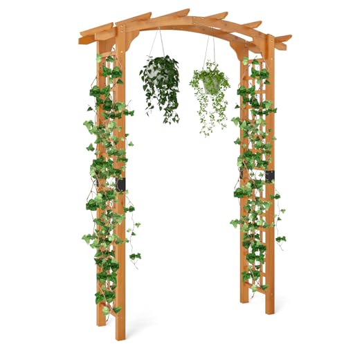 TANGZON Solid Wood Garden Arch, 215 cm/229 cm Outdoor Pergola Arbour with Hanging Roof & Side Trellises, Decorative Wedding Party Archway for Patio Yard Lawn (Arched Hanging Roof, 160 x 60 x 229cm)