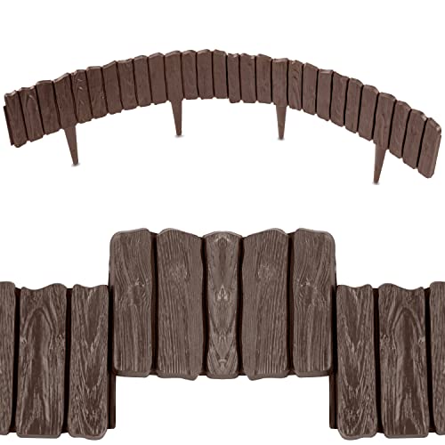 Brown Lawn Edging Border - 2.26 m / 7.4 ft Long Garden Palisade with Wood Bark Effect - Fencing with Ground Stakes - Perfect for Flower Beds, Lawn, Patio, Pavement