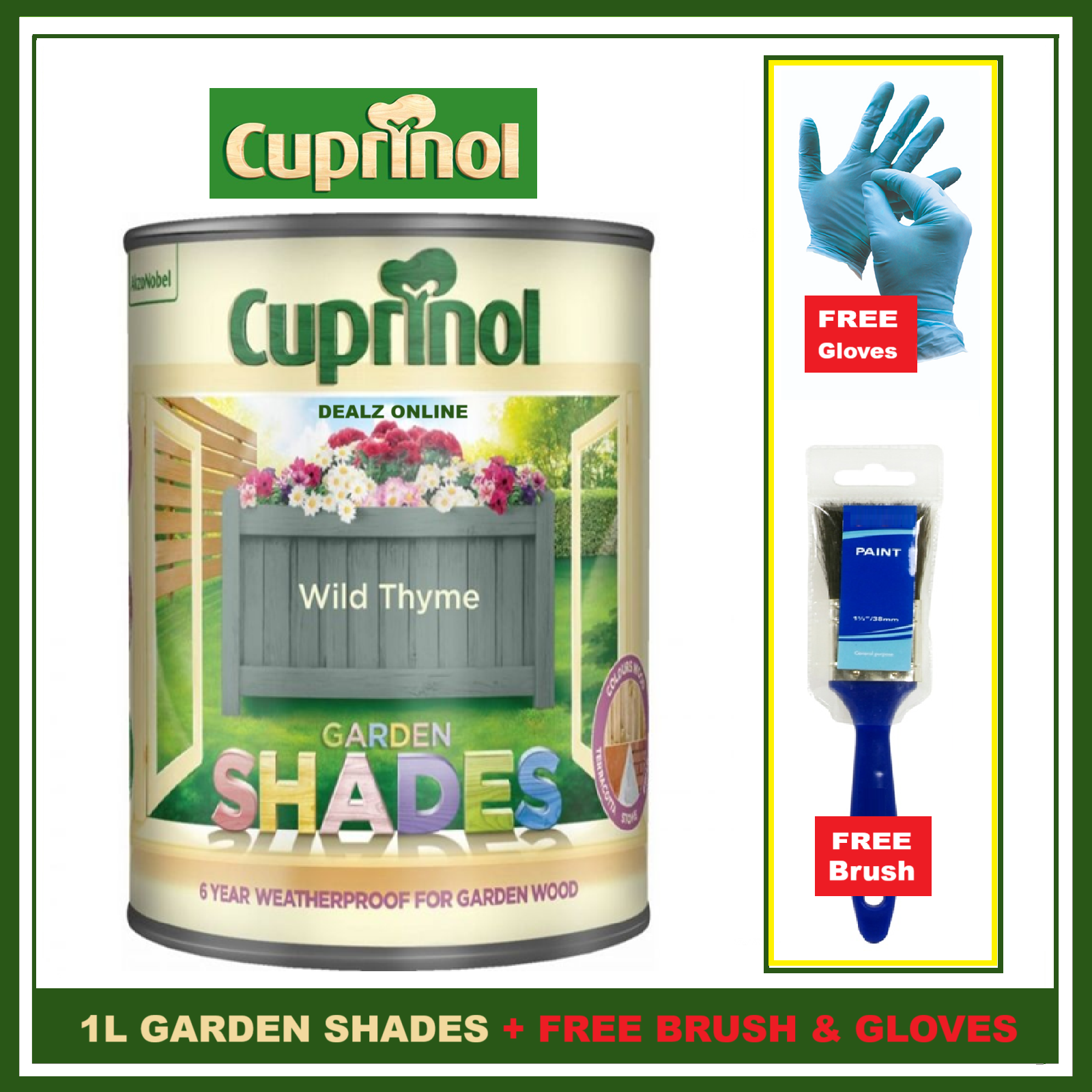 Cuprinol WILD THYME 1L Garden Shades Furniture Sheds Wood Paint FREE BRUSH &