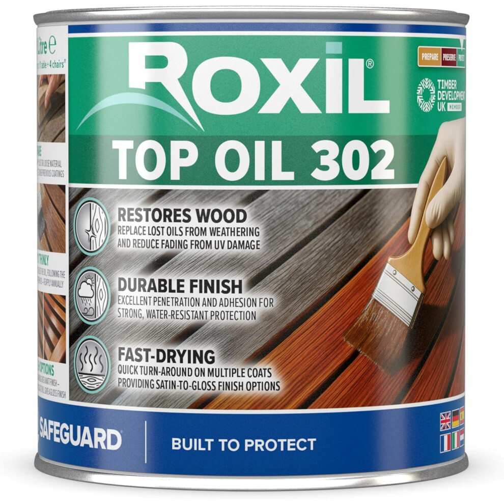 Roxil Top Oil 302 (1l, Clear) | Outdoor Wood Oil for Garden Furniture, Sheds, Planters, Decking | Water-Resistant Wood Sealer with Mould Defence