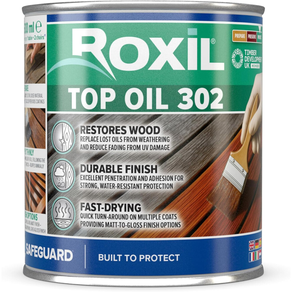 Roxil Top Oil 302 (500ml, Clear) | Outdoor Wood Oil for Garden Furniture, Sheds, Planters, Decking | Water-Resistant Wood Sealer with Mould Defence