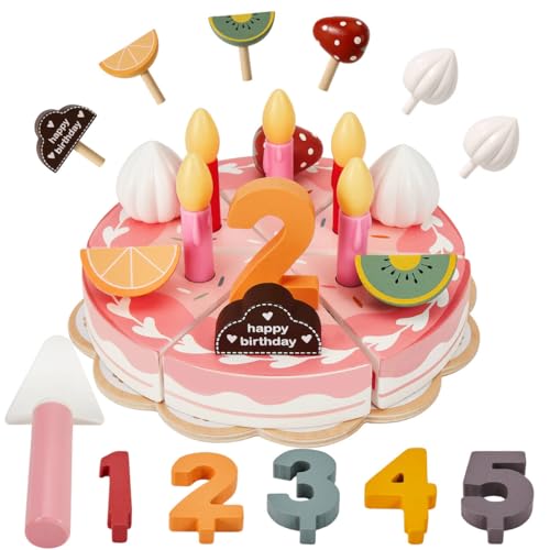 HERSITY Wooden Birthday Cake Toy Cutting Food Pretend Play Kitchen for Toddlers, Girls Afternoon Tea Party Set DIY Fruit Cake Toy with Candles Numbers Desserts Kids for 3 4 5 Years Old
