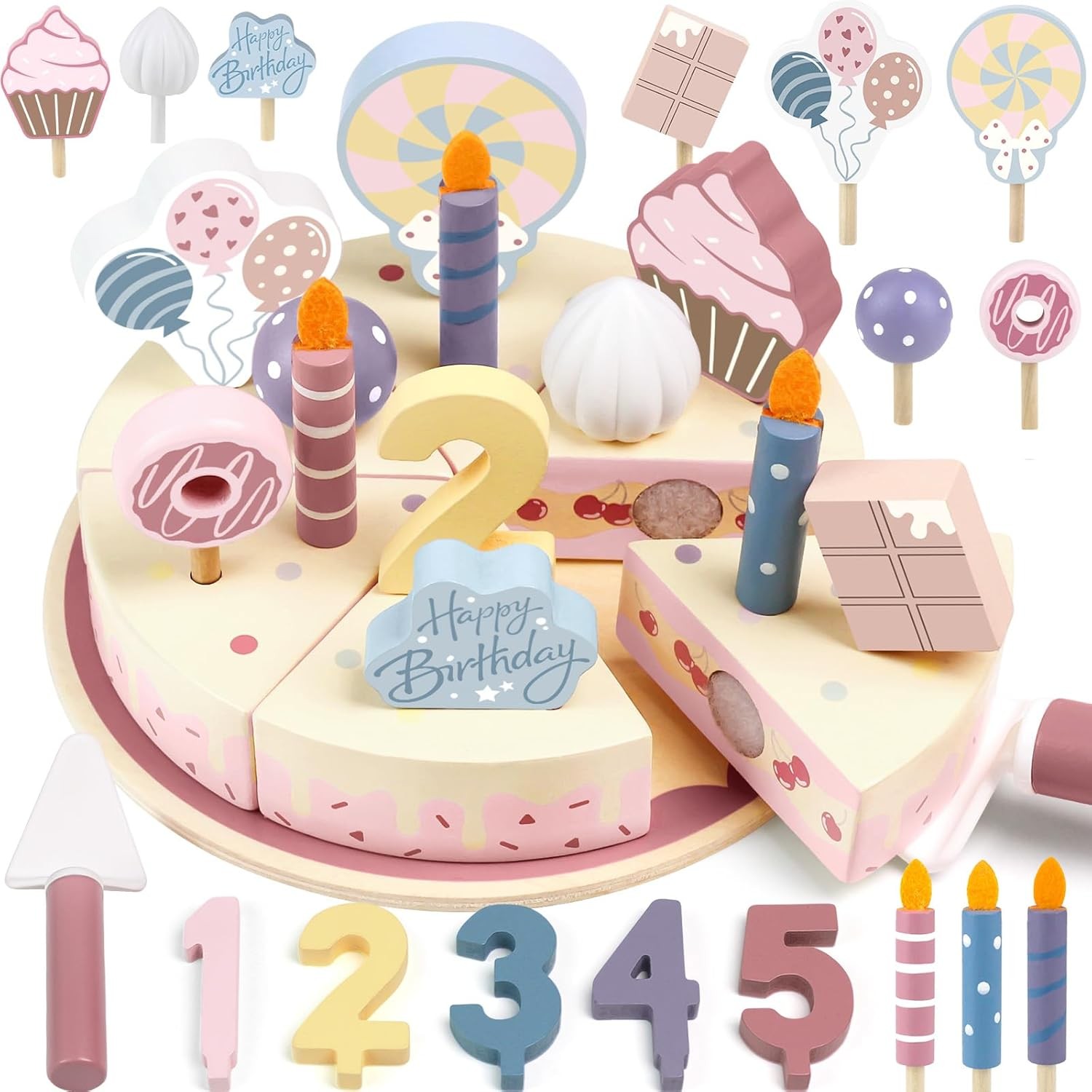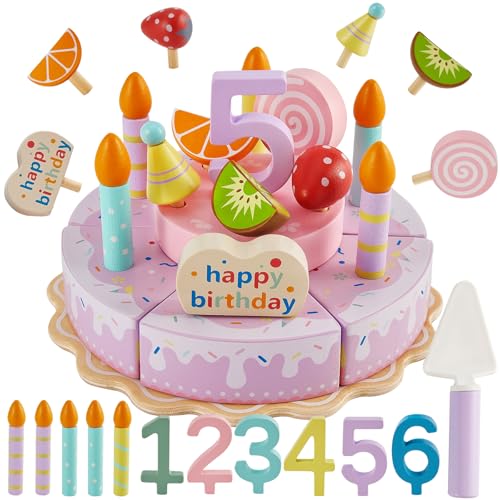 LINFUN KIDS Wooden Birthday Cake Play Food Set Kitchen Pretend Toy Kids Cake Cutting with Candles, DIY Tea Party Set Gifts for Little Girls Toddlers Children 3 4 5 Years Old, Pink