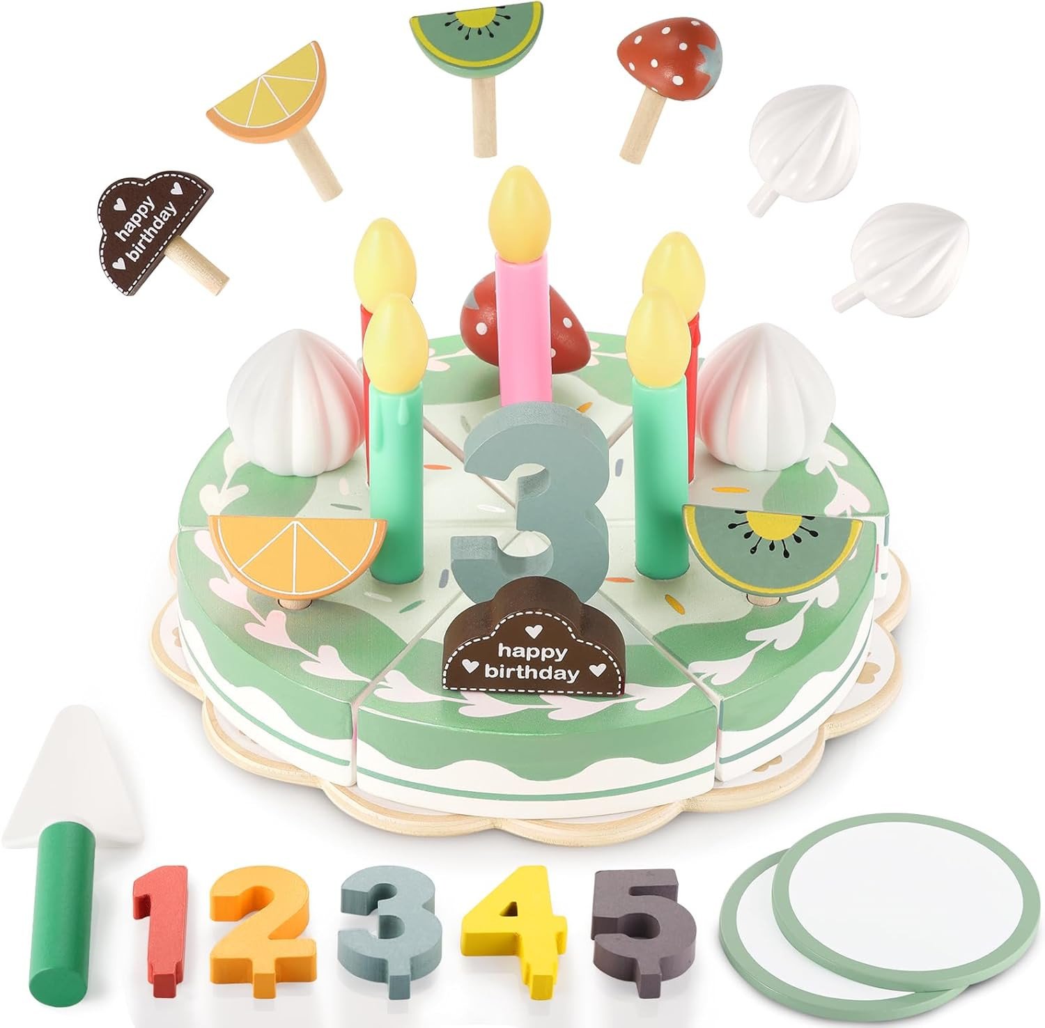UMU® Wooden Birthday Cake Toy – 6-Slice Play Cake Set with Numbers, Candles, Fruits & Accessories – Pretend Play Kitchen Toy for Boys and Girls Ages 3–6