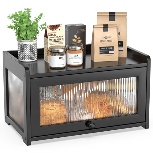 BAMBANG Bamboo Bread Bins for Kitchen, Wooden Bread Box Storage Container Box with 3 Sides Wavy & Back Clear Window, Large Breadbin Breadbox for Homemade Bread, Black