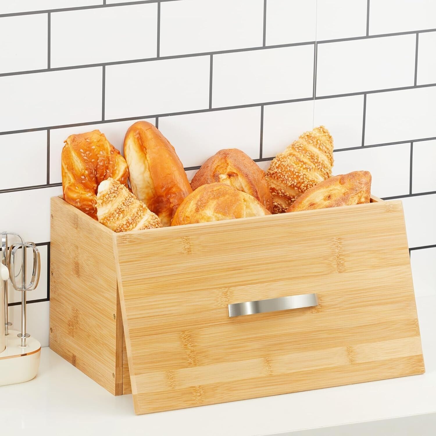 Bamboo Wooden Bread Bin Food Storage Box Holder With Lift Up Lid Huge Capacity