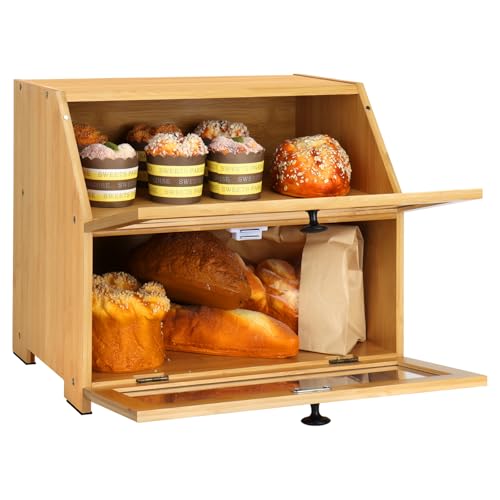 BAMBANG Double Layer Bamboo Bread Box for Kitchen Counter, Bread Bin Farmhouse Large Bread Box with 2 Doors, Wooden Breadbox Storage Container Holder for Homemade Bread, Natural