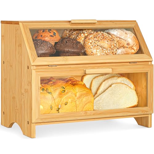 Golden Nature Double Layer Bamboo Bread Box for Kitchen Countertop - Large Wooden Storage Box w/Clear Display Windows - Food Keeper for Muffins, Bagels & Cookies