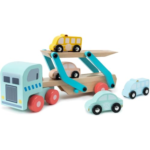 Speedy Monkey Wooden Car Transporter - Double-Deck Trailer with 4 Colourful Cars - Great Toys for 2 Year Old Girls, Toys for 3 Year Old Boys & Toys for 4 Year Old Boy - Develops Fine Motor Skills