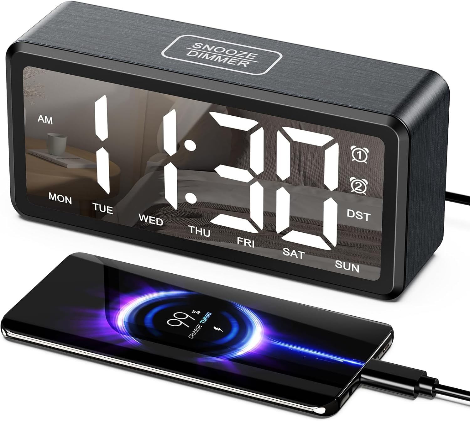 Mirror Digital Alarm Clock, Large LED Display Wooden-Style Alarm Clocks, Alarm