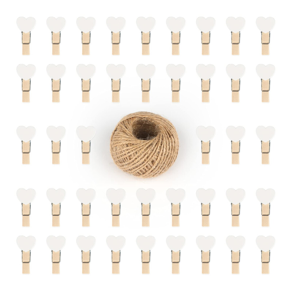 100PCS Mini Wooden Heart Pegs - 3.5cm Wooden Photo Display Clips - Tiny Wooden Clothes Pegs with 30 M Jute String for Arts and Crafts, Weddings &