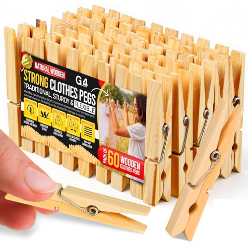 G4GADGET Wooden Clothes Pegs 60 Pack – Strong Laundry Pegs for Washing Line – Traditional Wooden Pegs with Metal Spring for Indoor & Outdoor Use, Crafts & DIY
