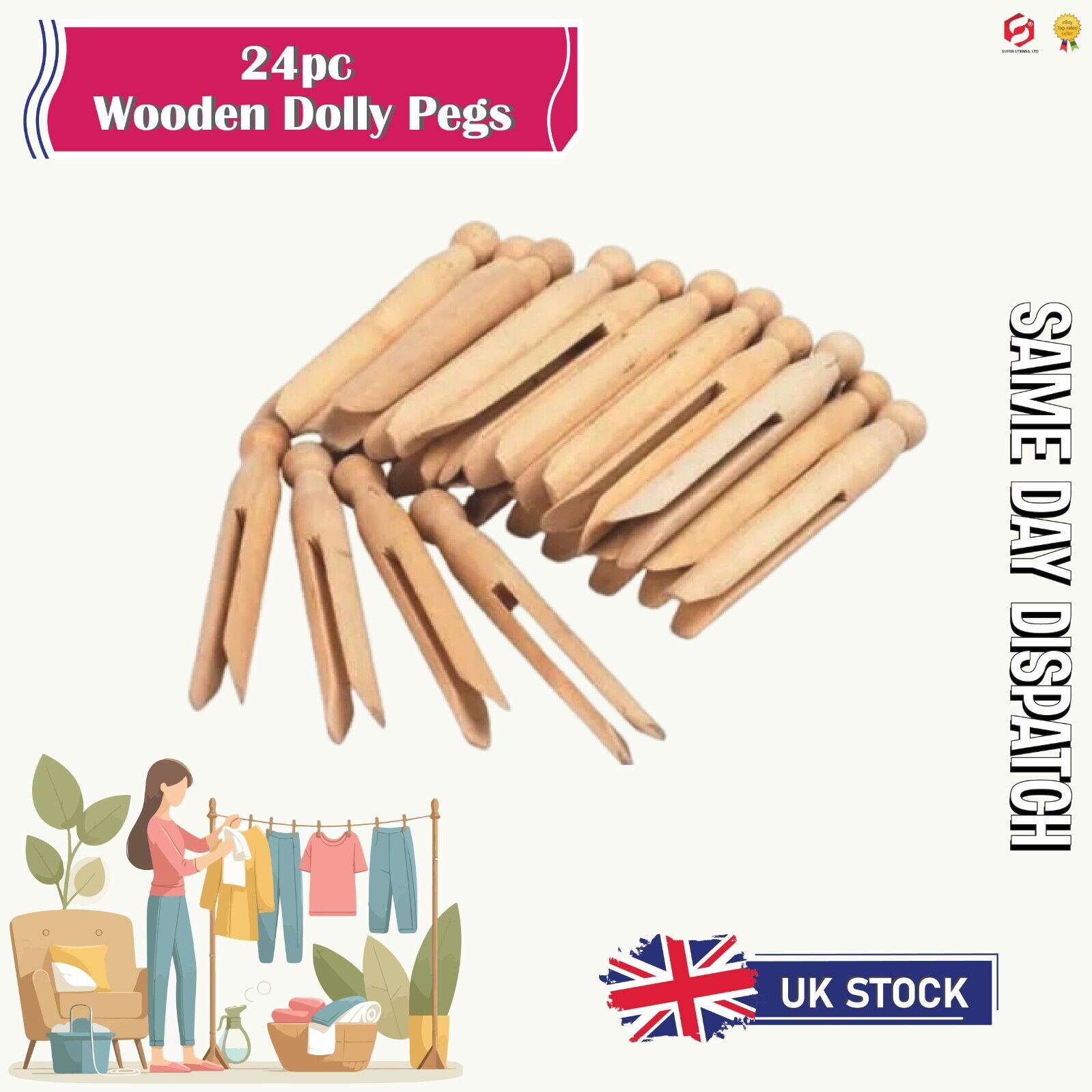 24 Pack Home Wooden Dolly Pegs Clothes Washing Line Traditional