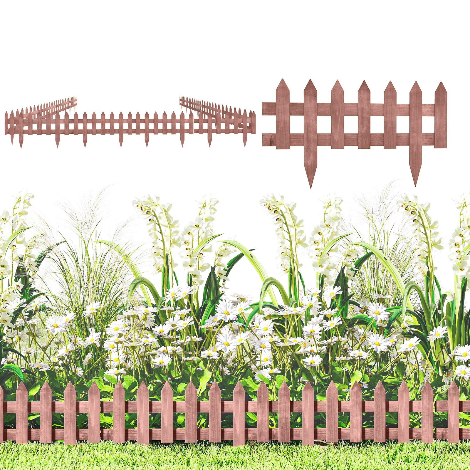 Pack of 12 Wooden Border Fences Garden Fixed Picket Fence for Lawn Brown