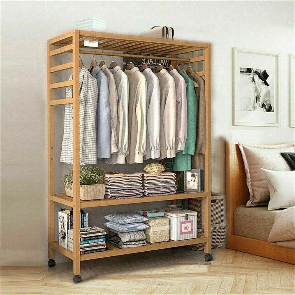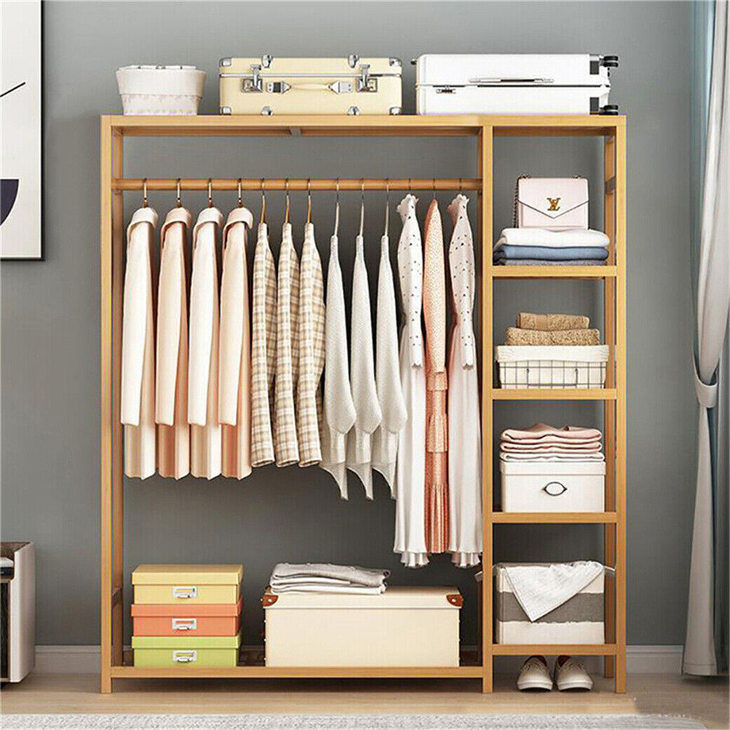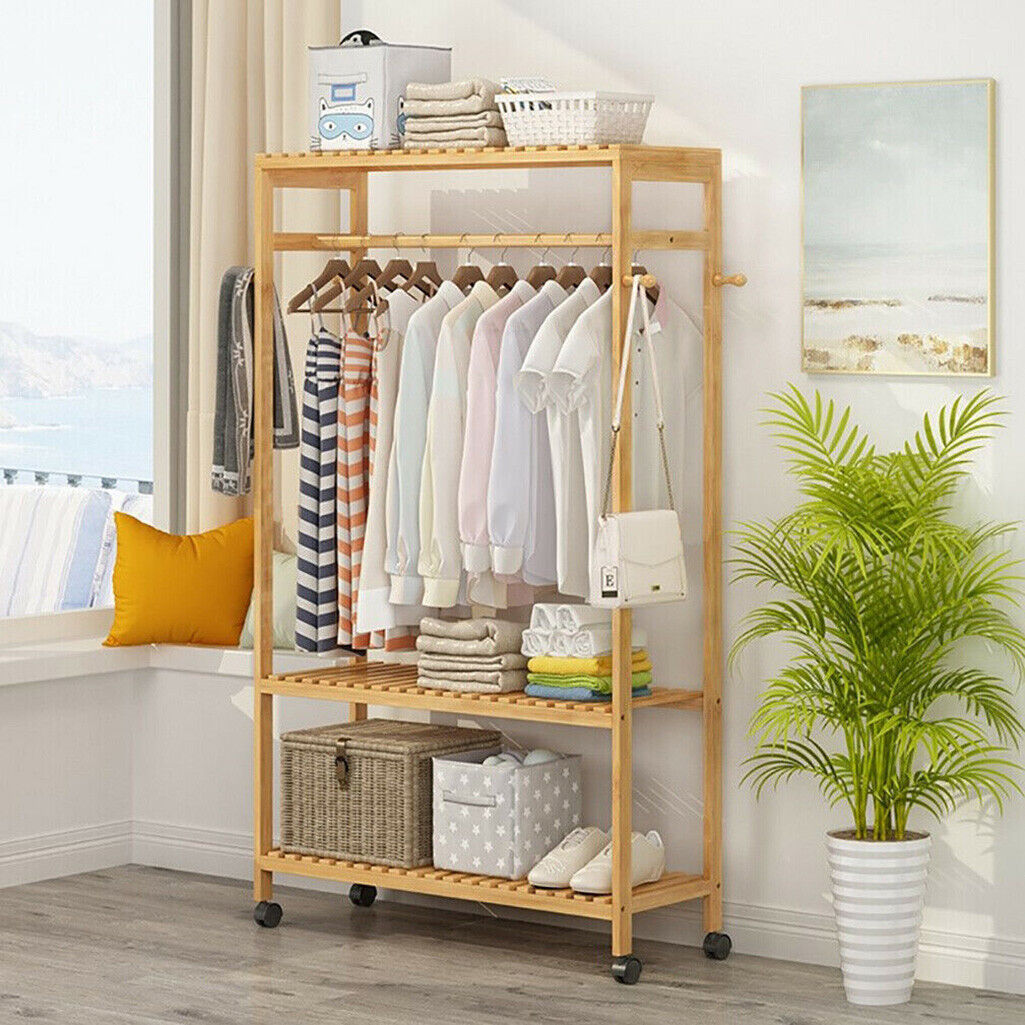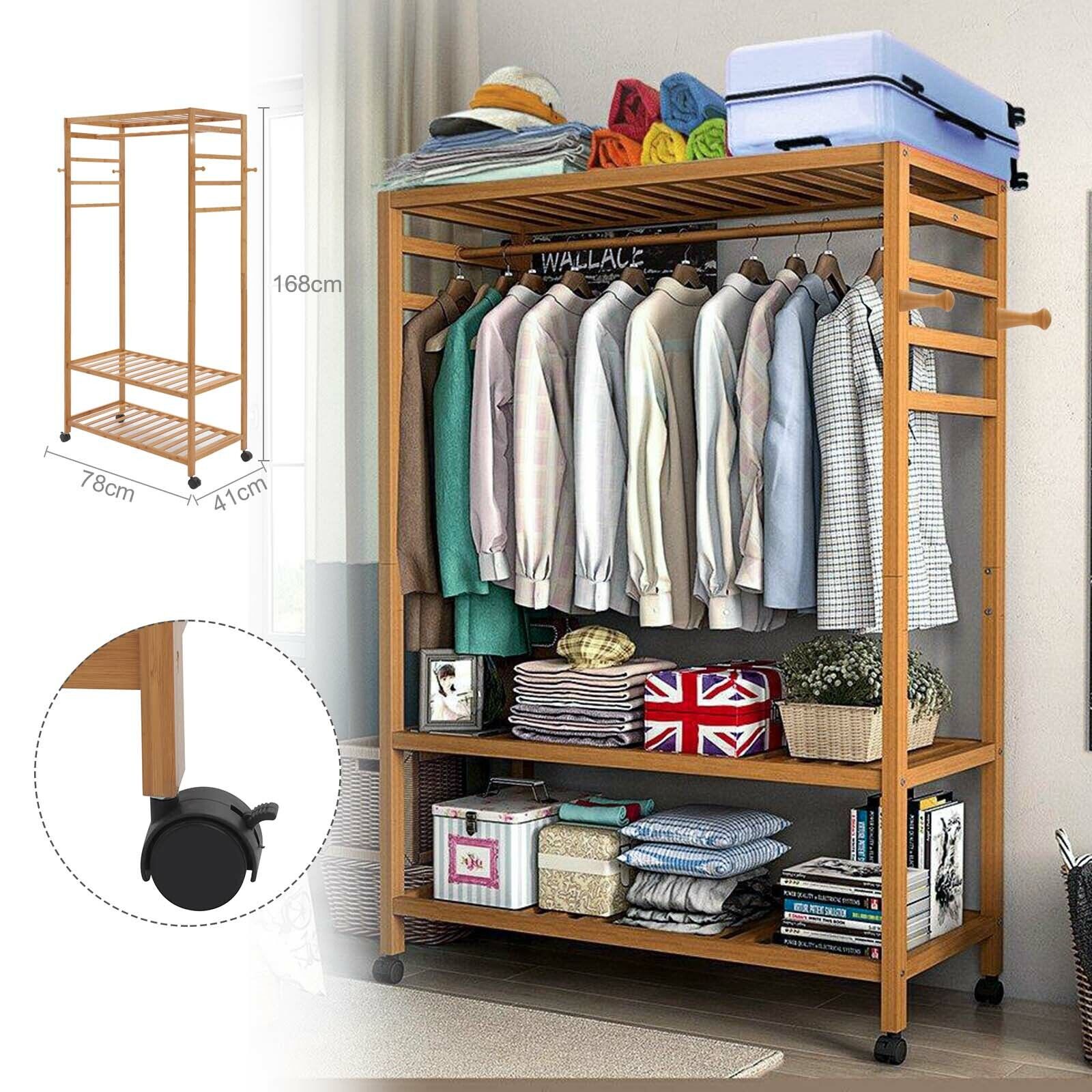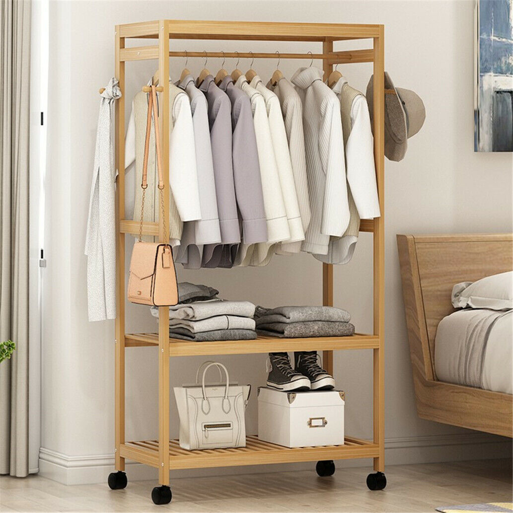 Wooden Clothes Rail Bedroom Wardrobe Stand Storage Rolling Garment Rack Shelves