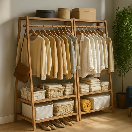Open Wardrobe - Wooden Clothes Rail with Drawers, Bamboo Garment Rack, Free Standing Design for Small Bedrooms