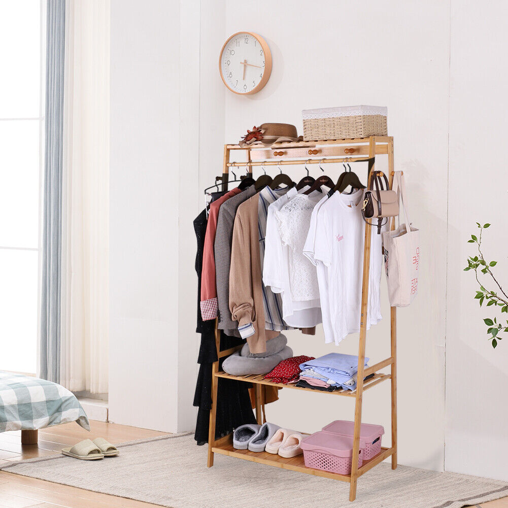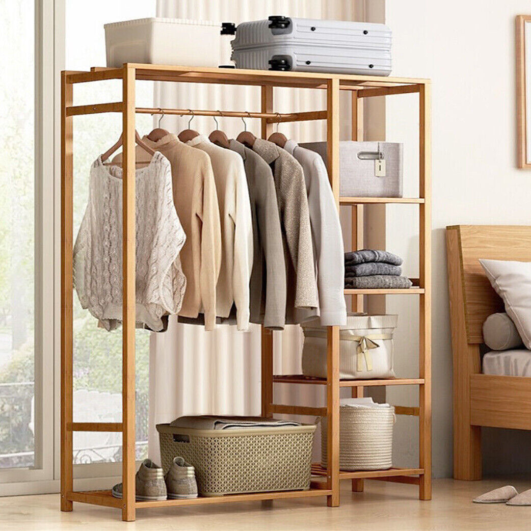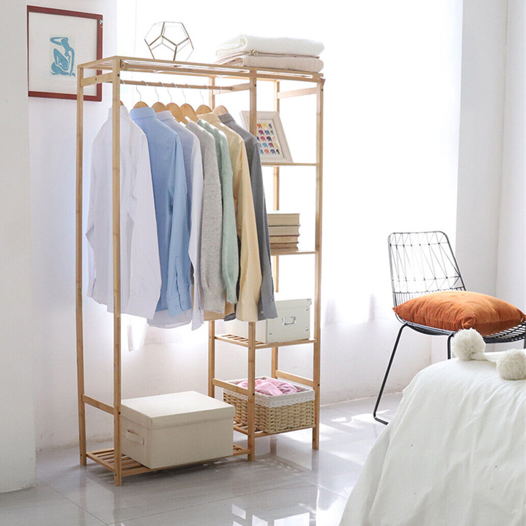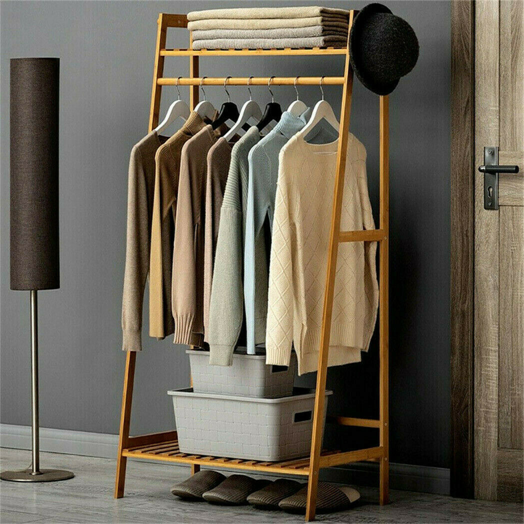 Wooden Clothes Rail Bamboo Garment Rack Hanging Stand Wardrobe Storage Shelf