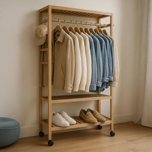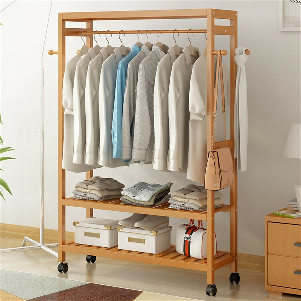 Wooden Clothes Rail Hanging Garment Shoe Rack Rolling Stand Portable Practical
