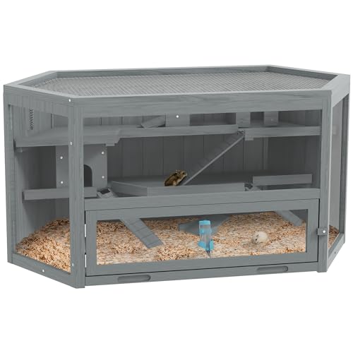 Pawhut Wooden Hamster House Hamster Cage With Shelf, For Dwarf Hamsters, Gerbils, Rutin Chickens, With Huts, 82 X 45 X 81 Cm, Dark Grey