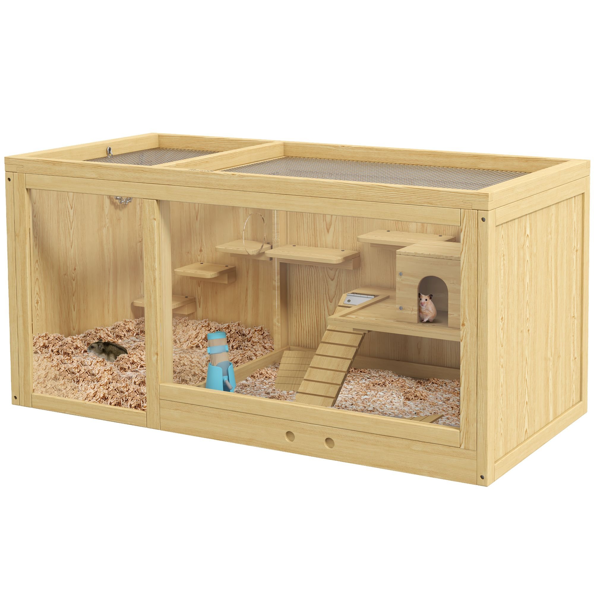 Pawhut Wooden Hamster Cage With Water Bottle, Platforms, Openable Roof, Sliding Tray, Hut, Seesaws, Natural Wood Finish