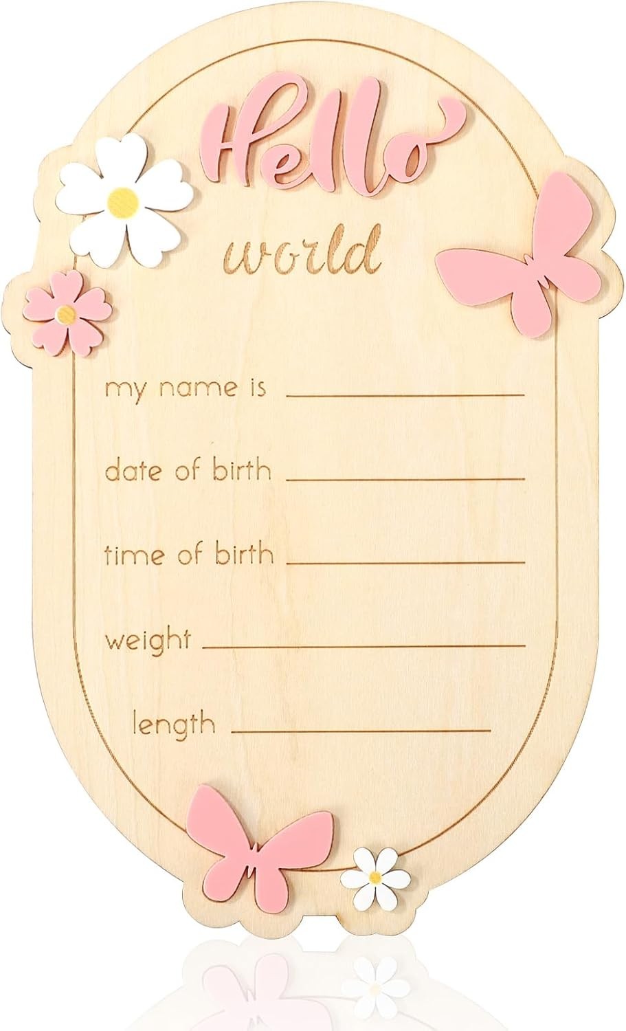 Wooden Baby Birth Announcement Sign, Hello World Newborn Name Signs Daisy & But