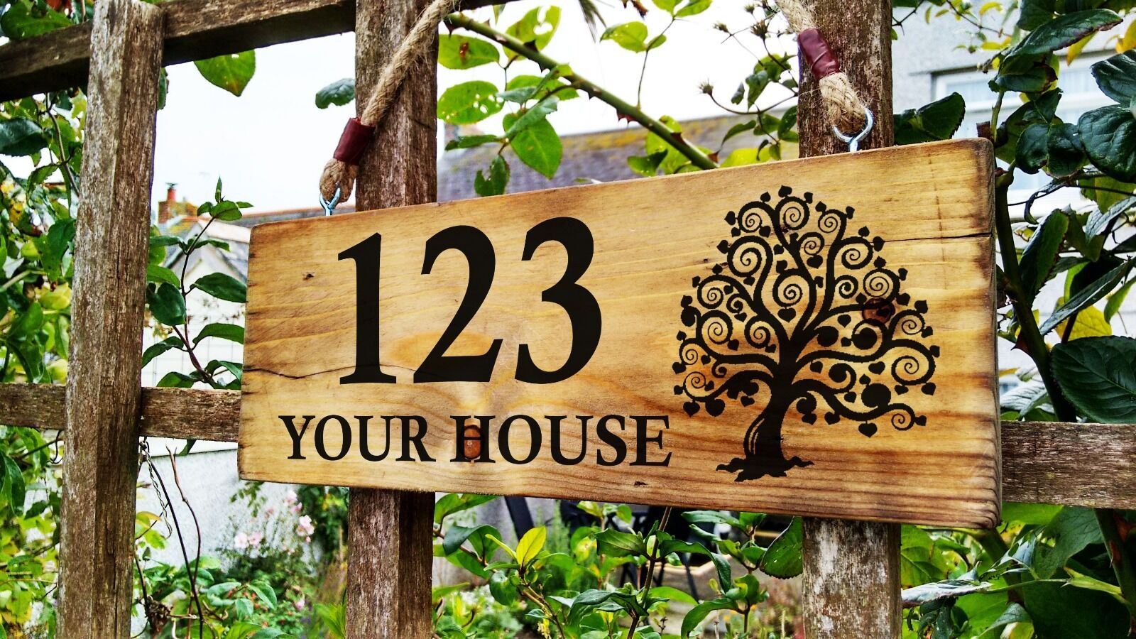 Tree of Life Wooden House Name Plaque Signs - Personalised - Solid Wood - LG