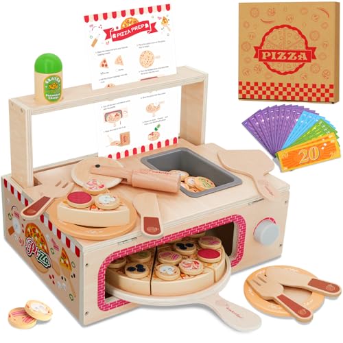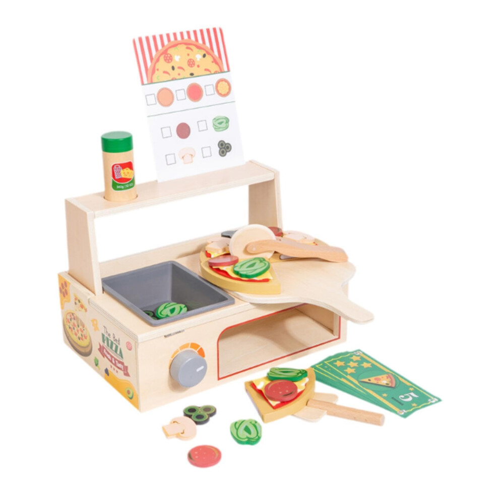 Wooden Pizza Toy - Learning Preschool Role Play Activity with Oven, Pizza Counter Wooden Playset, Interactive Educational Toy for 3+ Years Old Children Christmas Birthday Creative Play