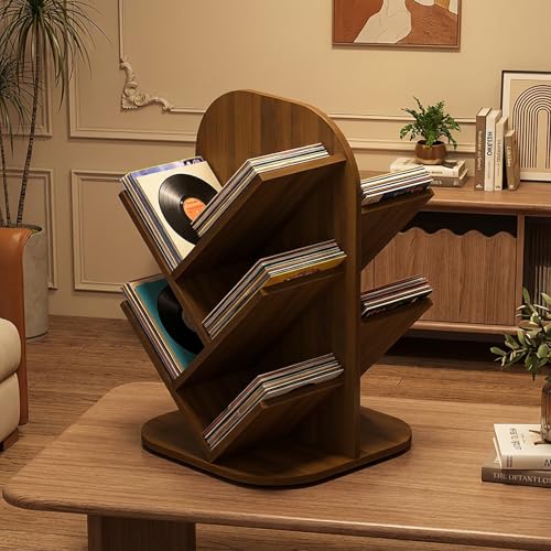 DKPLOE Wooden Record Player Stand Holds Up to 250+ Vinyls 360° Rotatable Mid-Century Vinyl Record Storage Suitable for Bedrooms Living Rooms Cafes and Study Rooms(Brown)