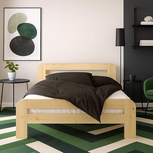 QJBSAVVA Solid Pine Single Bed Frame 140x190 cm, Untreated Rustic Low-Profile Wooden Slats, Quick-Assembly Small Double bed frame Modern Style for Bedroom, Guest Room or Studio