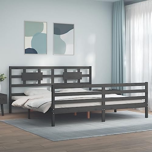 Qnhdfrt King Size Bed Frame 200x200 cm Solid Pine Wooden Slats Grey Double Bed Base with Headboard Sturdy Durable for Bedroom