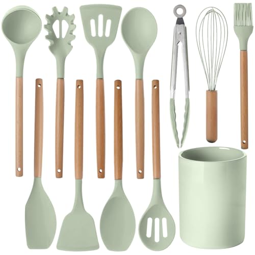 12 Pcs Kitchen Utensil Set, Silicone Cooking Utensils Set with Wooden Handle, Heat Resistant, Nonstick Cookware Tongs Spatula Spoon Set with Storage Bucket for Home, Camping, Dishwasher Safe (Green)