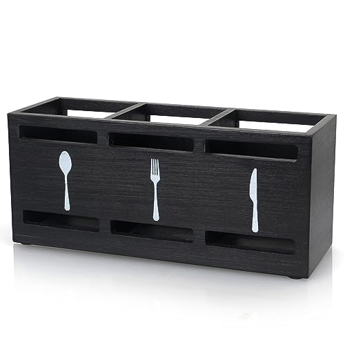 FGUUTYM Modern Wooden Utensil with 3 Compartments, Cutlery Holder for Countertop, Kitchen Utensil Organiser, Storage Container for Fork and Spoon Kitchen Utensils (Black, One Size)