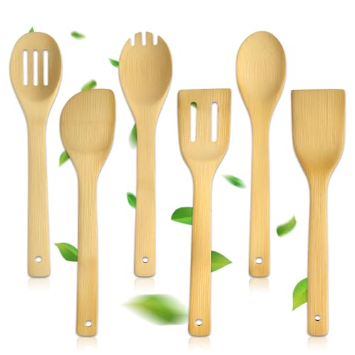 Joeji's Kitchen 6 Bamboo Wooden Kitchen Utensils for Cooking, Resistant & Stylish Bamboo Utensils: Wooden Spoon, Slotted Spoon, Slotted Spatula, Spork, Spatula with Hole