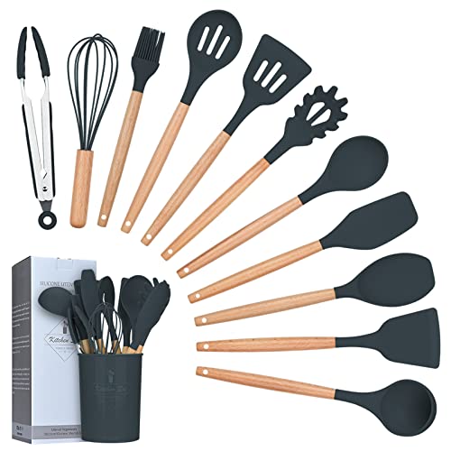 Lychee 12pcs Silicone Cooking Kitchen Utensils Set with Holder, Nonstick Cookware,Heat Resistant Wooden Handles Cooking Tool, BPA Free Non Toxic Tongs Spatula Spoon Kitchen Gadgets Set (Grey)