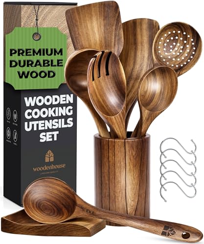 Wooden Spoons Cooking Utensils - Teak Wooden Utensil Set of 12 Pcs with Holder, Spoon Rest & Hanging Hooks, Non-Stick and Heat Resistant Kitchen Accessories by Woodenhouse