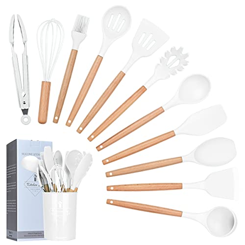 Lychee 12pcs Silicone Cooking Kitchen Utensils Set with Holder, Nonstick Cookware,Heat Resistant Wooden Handles Cooking Tool, BPA Free Non Toxic Tongs Spatula Spoon Kitchen Gadgets Set (White)