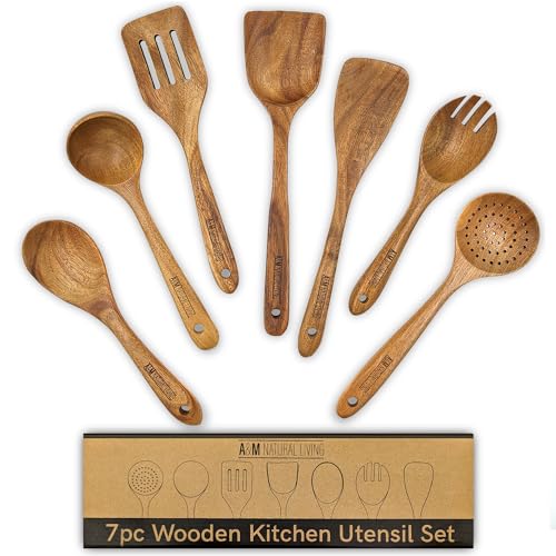 A&M Natural Living Wooden Kitchen Utensils Set of 7 for Cooking, Wooden Kitchen Utensils Including Wooden Spoons, Serving Spoon, Wooden Spatula Set, Wooden Spoons Cooking Kitchen Sets