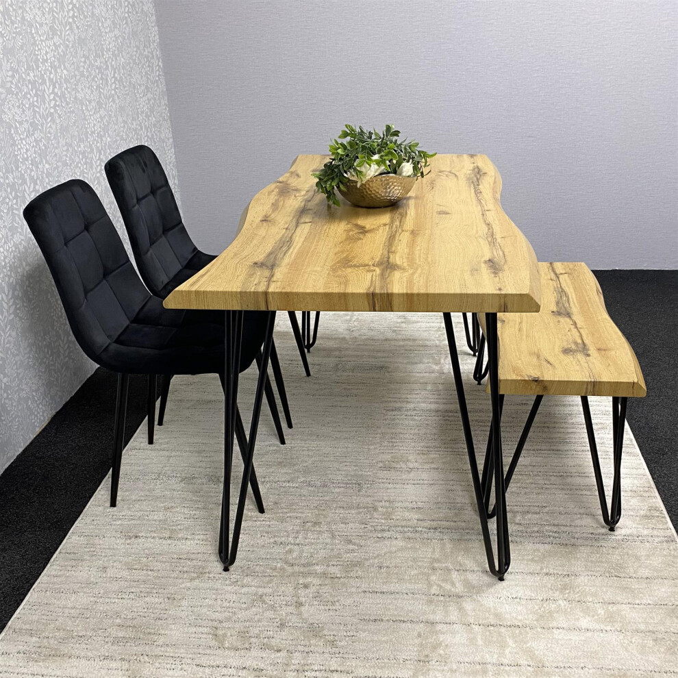 Wooden Dining Table with Bench and 2 Black Velvet Chairs