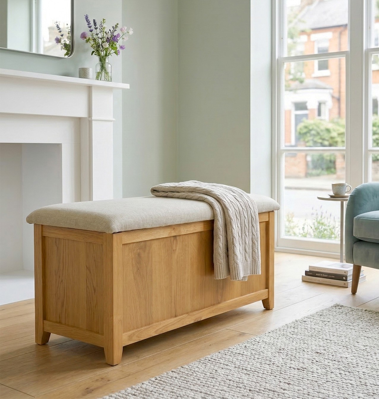 Hallowood Furniture London Oak Large Blanket Box with Thick Top Lid, Solid Oak Wooden Ottoman Storage Box, Toy Trunk, Blanket Chest, Wooden Storage Chest for Bedroom or Living Room