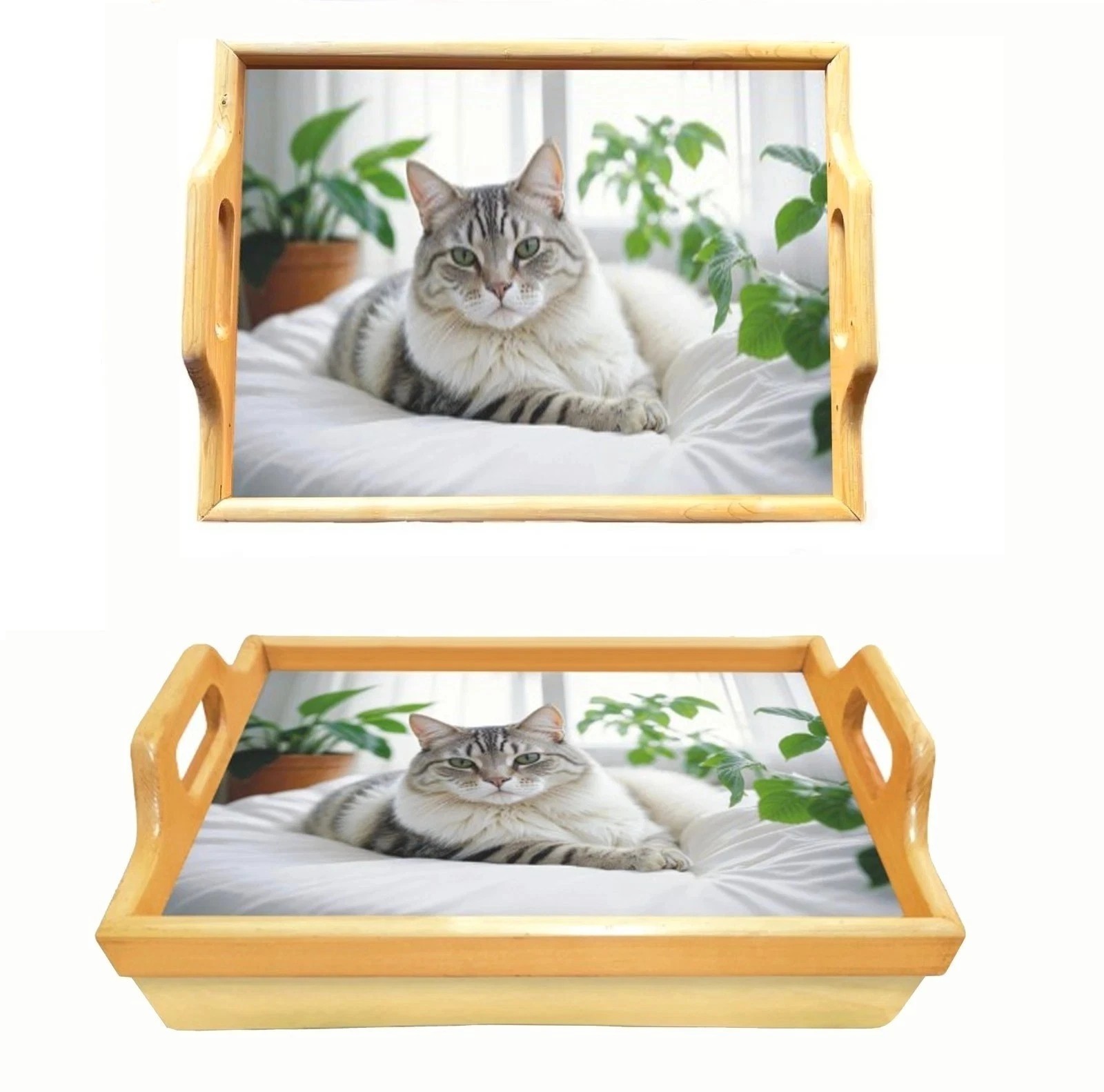 Wooden Serving Tray with Handles Cat Print Design Decorative Breakfast Tea Table