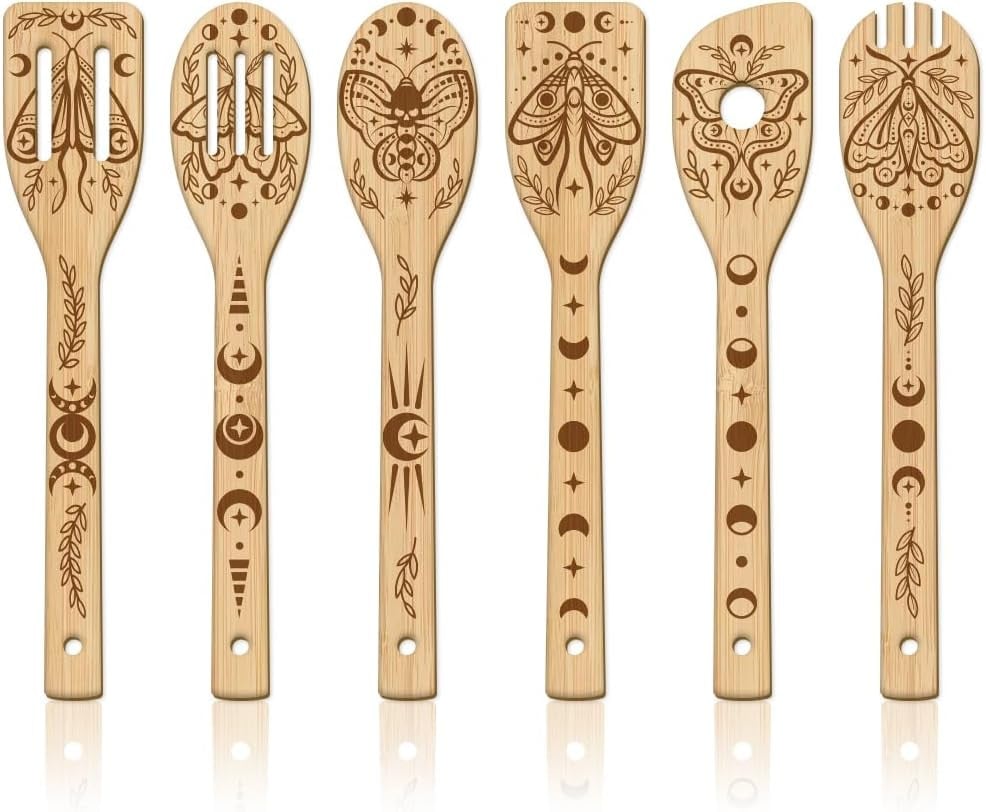 GLOBLELAND 6Pcs Moon Moth Wooden Spoons Utensil Set Moon Phases Bamboo Carving K