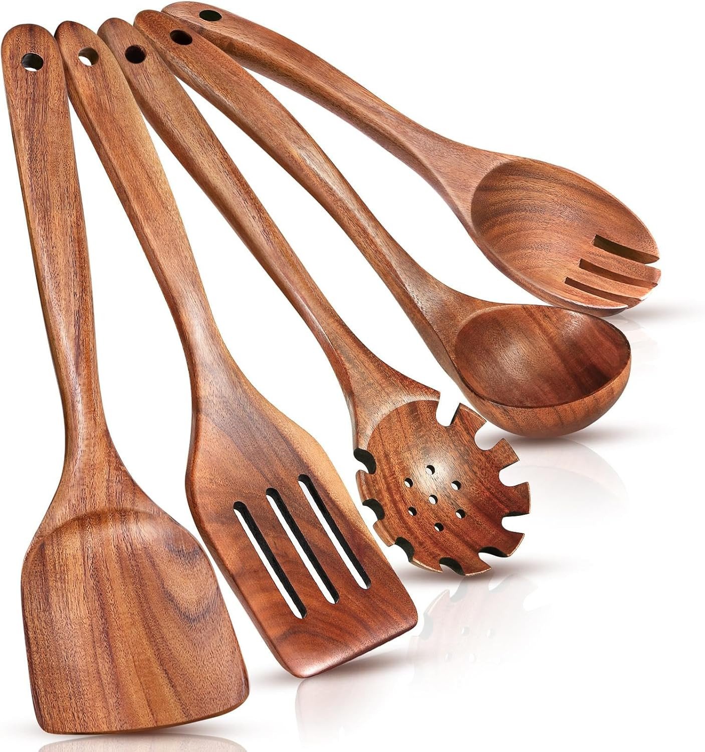 Natural Teak Wooden Kitchen Utensils Set - Wooden Utensil Set for Non-Stick Pans