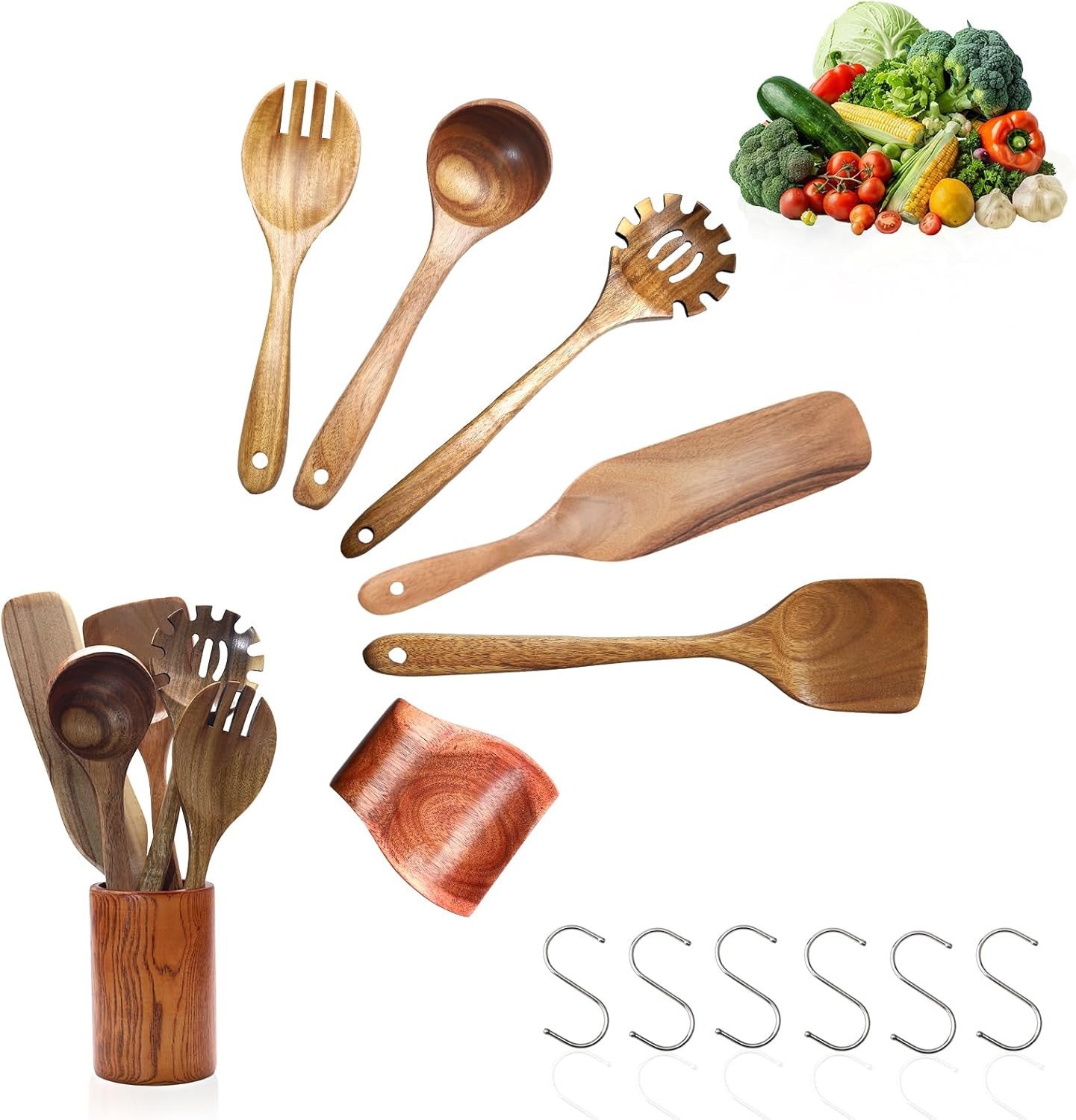 Teak Wooden Kitchen Utensil Set - 7Pcs Wooden Cooking Utensils Including Spatula