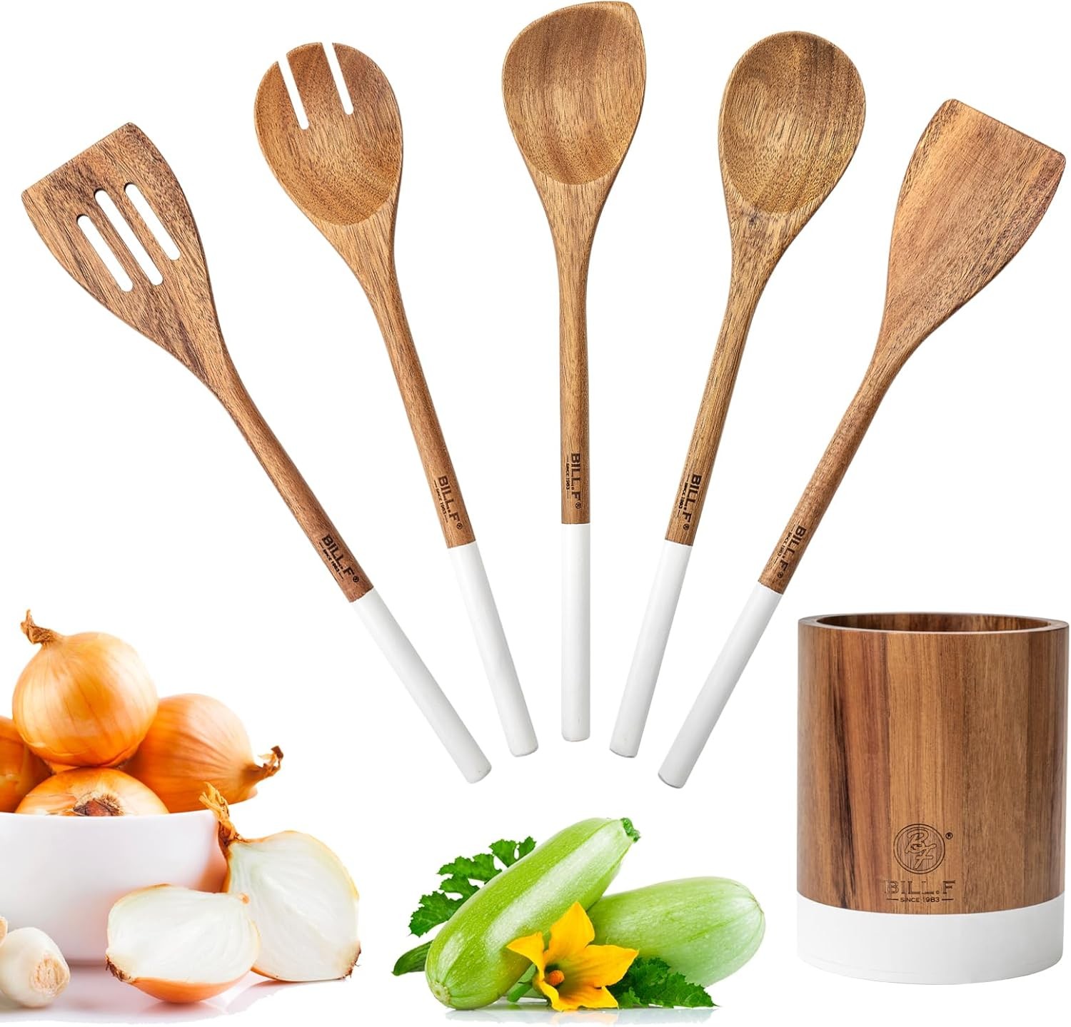 AMFUN 6 Pcs Wooden Utensil Set,Wooden Spoon Cooking Utensils Set for Cooking, Baking,Premium Long Wood Spatulas,Non-Scratch, Heat Resistant,Slotted Wood Bamboo Spoons