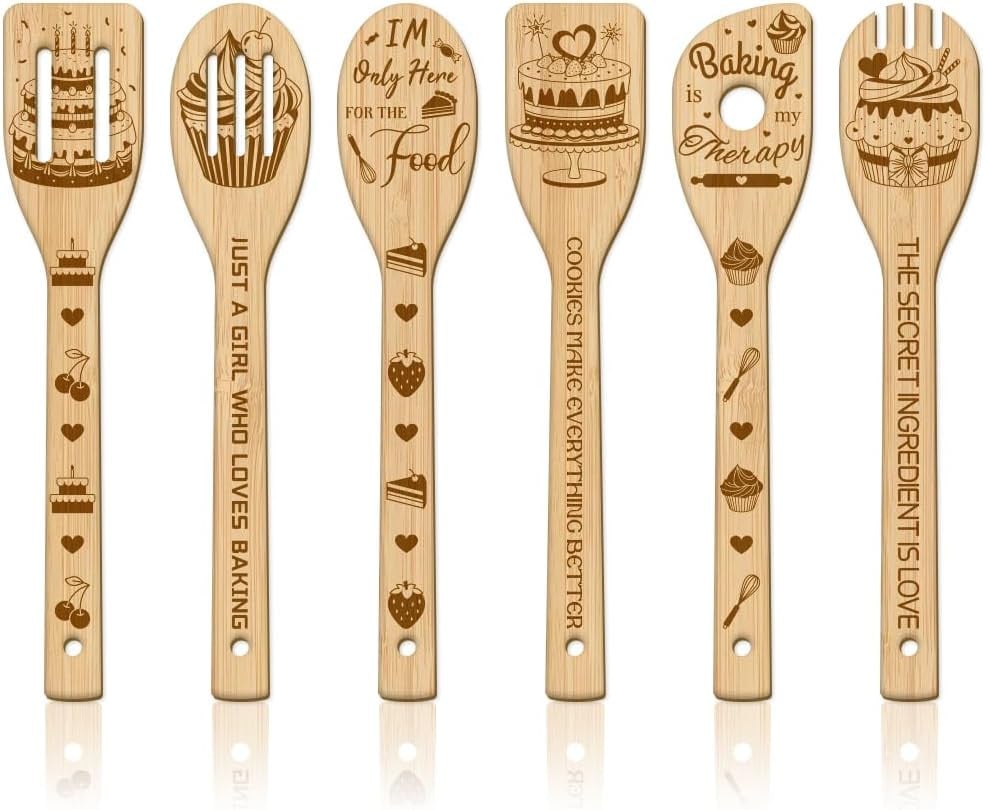 GLOBLELAND 6Pcs Kitchen Quotes Wooden Spoons Utensil Set Text Bamboo Carving Coo