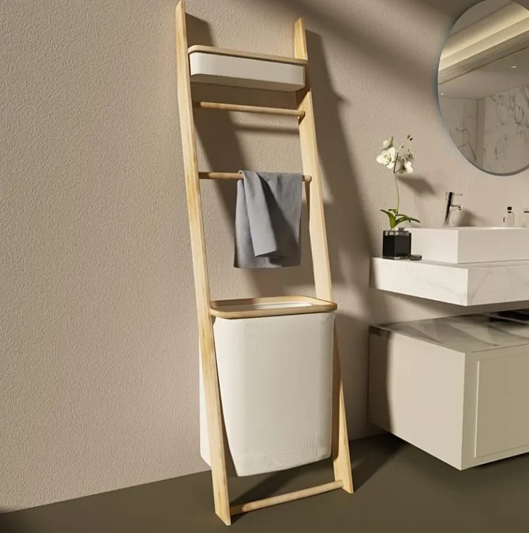 Wooden Storage Basket with Washing Laundry Basket Bag Towel Rack Wall-Mounted