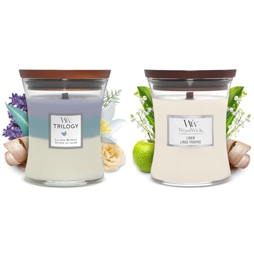 Woodwick Medium Hourglass Trilogy Scented Candle | Calming Retreat | Crackling Wick | Up to 60 Hours Burn Time | Lavender Spa, Sea Salt, Cotton and White Tea