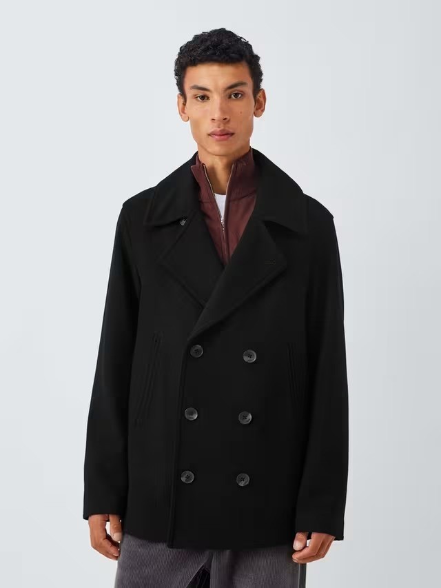 NEW John Lewis Men's Double Breasted Wool Blend Peacoat Jacket - Black - XL
