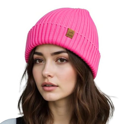 ACUSHLA Waterproof Windproof Cuff Beanie Winter Hat Stretchy Soft Cuffed Wooly Beanie with Thermal Thick Fleece Lining, Gifts for Men/Women/Her/Him (Neon Pink)